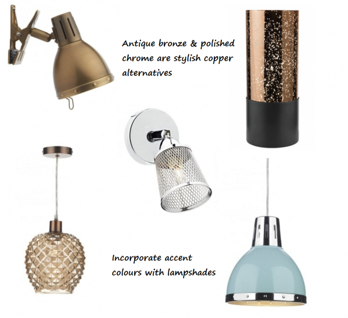 ● Copper & polished chrome – Copper and rose gold finishes have been a recent hit with many home interior bloggers and interiors magazines due to their unique look and ability to lighten up a room. We love polished chrome as an alternative which offers that similar sleek and cool finish.