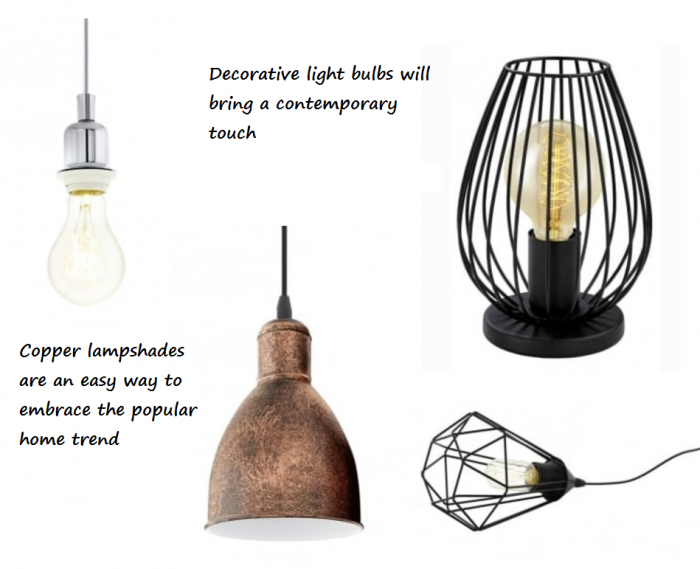 Eglo lighting is another brand that provides some affordable lighting choices. Embrace the geometric lighting trend with the Eglo pendant lights and table lamps that are a simple solution to updating a lounge light. A cage light with a decorative light bulb can add style to the home with minimal effort or investment! Even simply opting for a light fitting that reflects the polished chrome or copper trend can be subtle ways of updating a lounge or hallway.